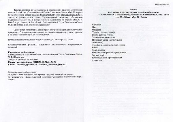 27-28 сентября 2012 года в рамках празднования 70-летия создания Белорусского штаба партизанского движения, партизанской бригады им. Краснознаменного Ленинского комсомола и 100-летия со дня рождения командира 1-й Витебской партизанской бригады Михаила Федоровича Бирюлина состоится научно-практическая конференция "Партизанское и подпольное движение на Витебщине в 1941-1944 гг."